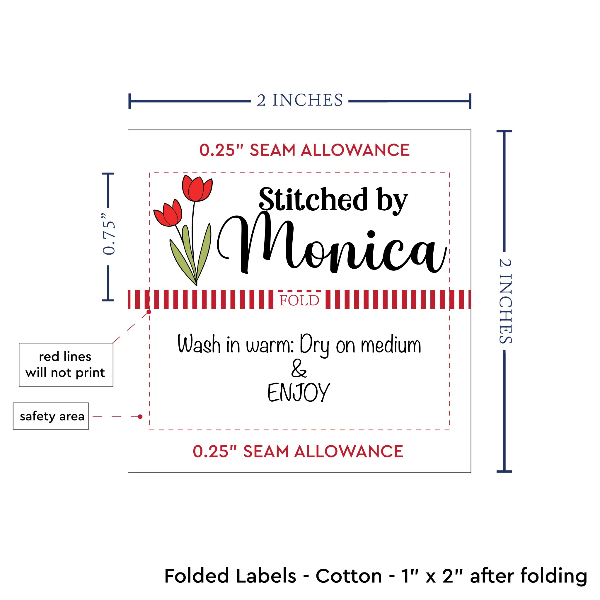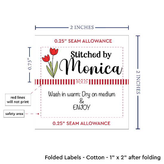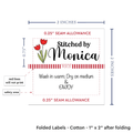 Personalized cotton labels measuring 2”x1”. Available as Flat or Fold Over tags in either sew on or iron on options. See below for full description and to design and preview your custom labels