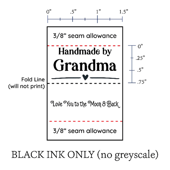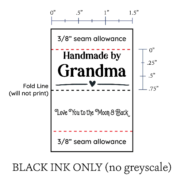 Personalized satin labels measuring 0.75”x1.5” once folded and sewn in. Printed with black ink on white satin ribbon. Cut edges should be sewn into a seam or turned under. See below for full description and to design and preview your custom labels.