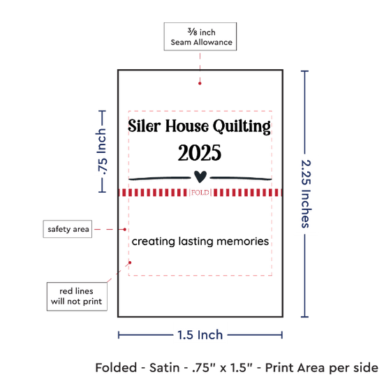 Personalized satin labels measuring 0.75”x1.5” once folded and sewn in. Printed with black ink on white satin ribbon. Cut edges should be sewn into a seam or turned under. See below for full description and to design and preview your custom labels.