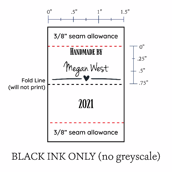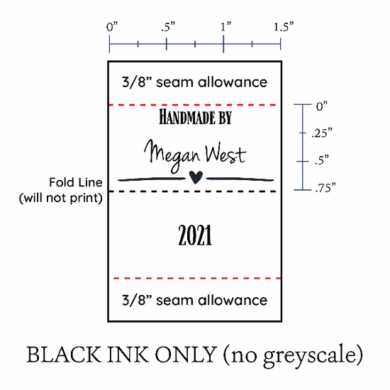 Personalized satin labels measuring 0.75”x1.5” once folded and sewn in. Printed with black ink on white satin ribbon. Cut edges should be sewn into a seam or turned under. See below for full description and to design and preview your custom labels.