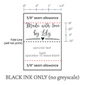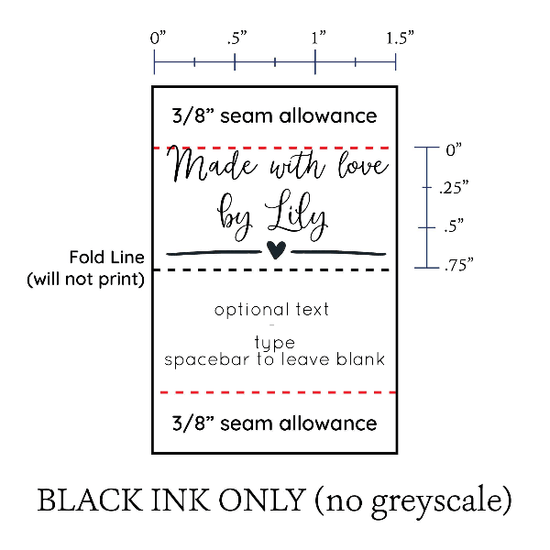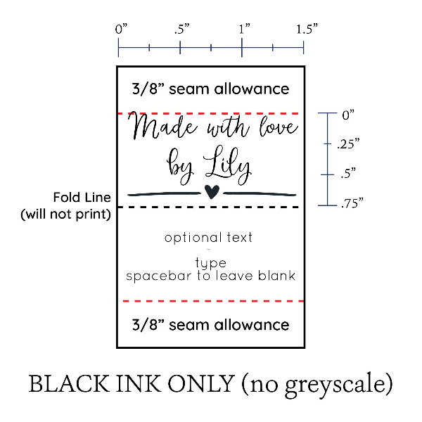 Personalized satin labels measuring 0.75”x1.5” once folded and sewn in. Printed with black ink on white satin ribbon. Cut edges should be sewn into a seam or turned under. See below for full description and to design and preview your custom labels.