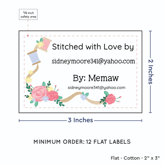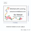 Personalized cotton labels measuring 2”x3”. Available as Flat tags in either sew on or iron on options. See below for full description and to design and preview your custom labels