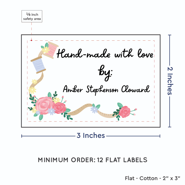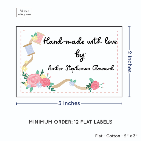 Personalized cotton labels measuring 2”x3”. Available as Flat tags in either sew on or iron on options. See below for full description and to design and preview your custom labels