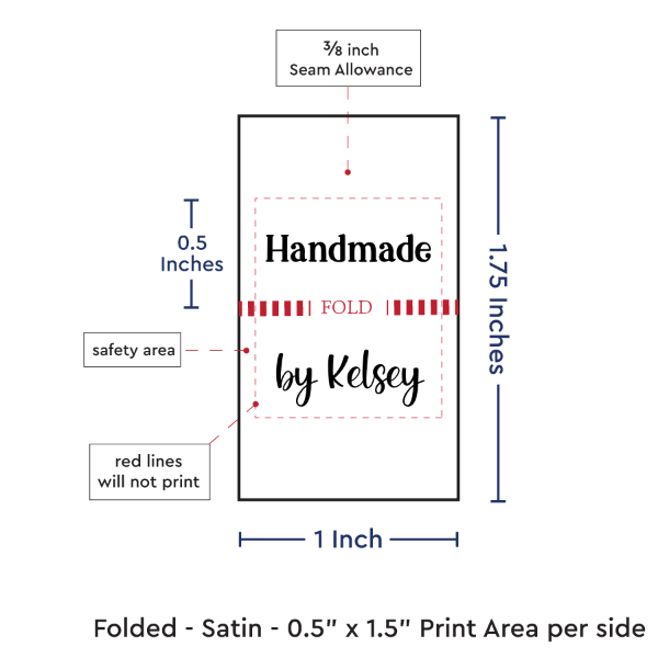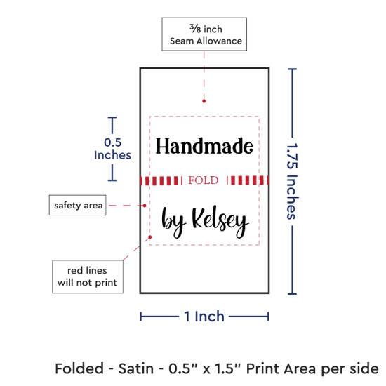 Personalized satin labels measuring 0.5”x1” once folded and sewn in. Printed with black ink on white satin ribbon. Cut edges should be sewn into a seam or turned under. See below for full description and to design and preview your custom labels.