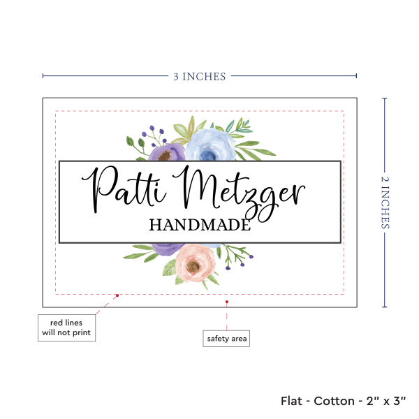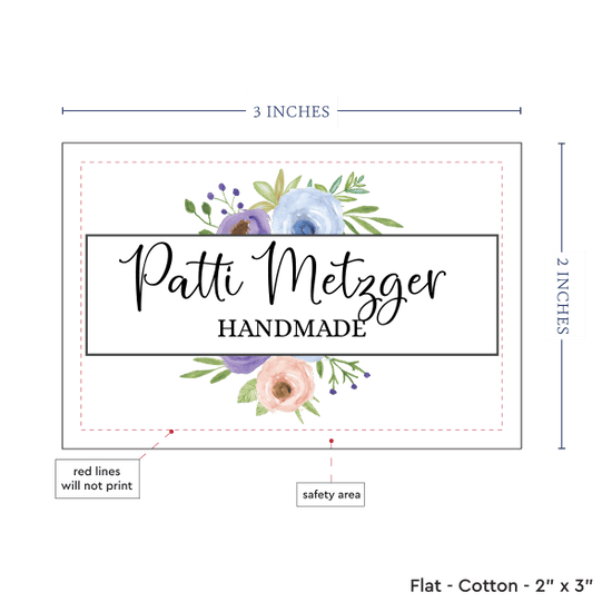 Personalized cotton labels measuring 2”x3”. Available as Flat tags in either sew on or iron on options. See below for full description and to design and preview your custom labels