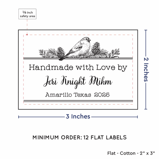 Personalized cotton labels measuring 2”x3”. Available as Flat tags in either sew on or iron on options. See below for full description and to design and preview your custom labels