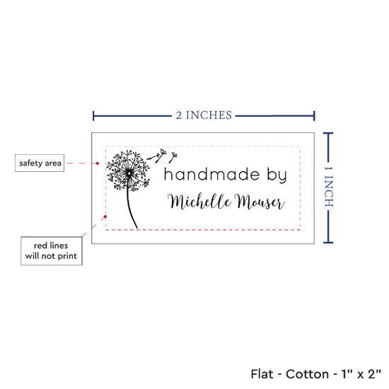 Personalized cotton labels measuring 2”x1”. Available as Flat or Fold Over tags in either sew on or iron on options. See below for full description and to design and preview your custom labels